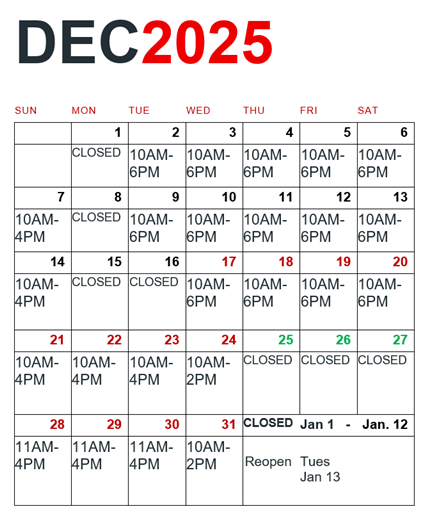 As the Holidays are approaching we want to give you a heads up with our adjusted Holiday Hours. When ordering please note the hours for said date. Cheers!